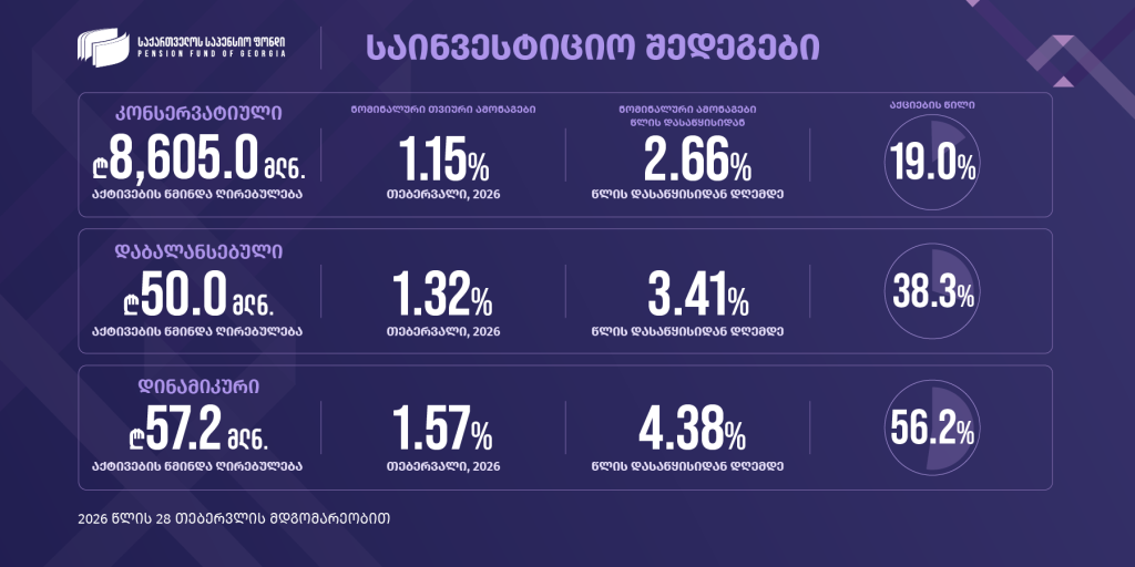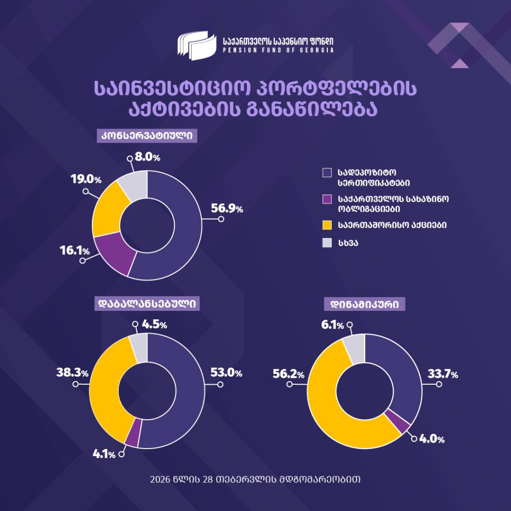 თებერვალში საპენსიო ფონდის პორტფელებმა პოზიტიური შედეგები აჩვენეს, რასაც ხელი შეუწყო როგორც საერთაშორისო აქციების ბაზარზე არსებულმა დადებითმა დინამიკამ, ისე ადგილობრივი აქტივების სტაბილურად მაღალმა შემოსავლიანობამ.