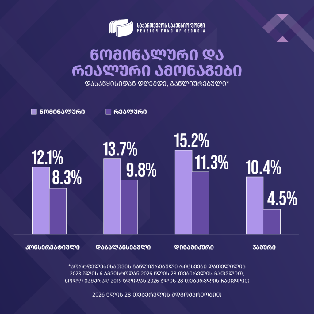 ყველაზე მაღალი, 1.57%-იანი ზრდა დინამიკურმა პორტფელმა დააფიქსირა, ხოლო დაბალანსებული და კონსერვატიული პორტფელების მომგებიანობამ შესაბამისად 1.32% და 1.15% შეადგინა.