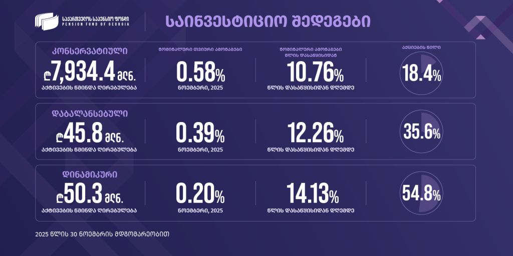 საქართველოს საპენსიო ფონდის აქტივებმა ნოემბრის ბოლოსთვის 8.0 მილიარდ ლარს გადააჭარბა, ხოლო დაგენერირებულმა ამონაგებმა – 2.2 მილიარდ ლარს მიაღწია.