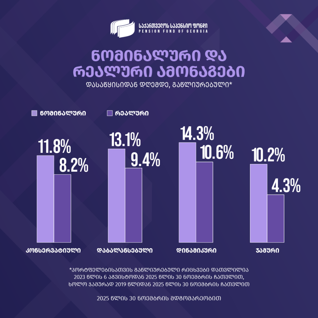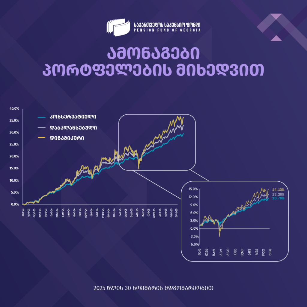 ნოემბერში ყველაზე მაღალი, 0.58%-იანი ზრდა კონსერვატიულმა პორტფელმა დააფიქსირა, ხოლო დაბალანსებული და დინამიკური პორტფელების მომგებიანობამ შესაბამისად 0.39% და 0.20% შეადგინა.